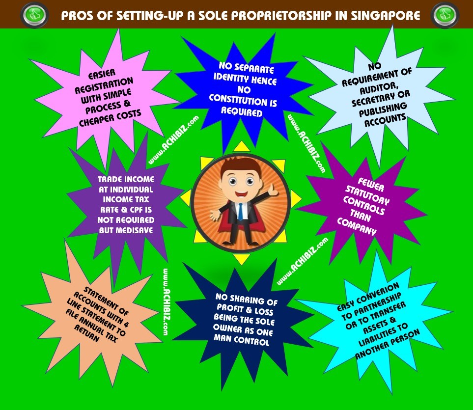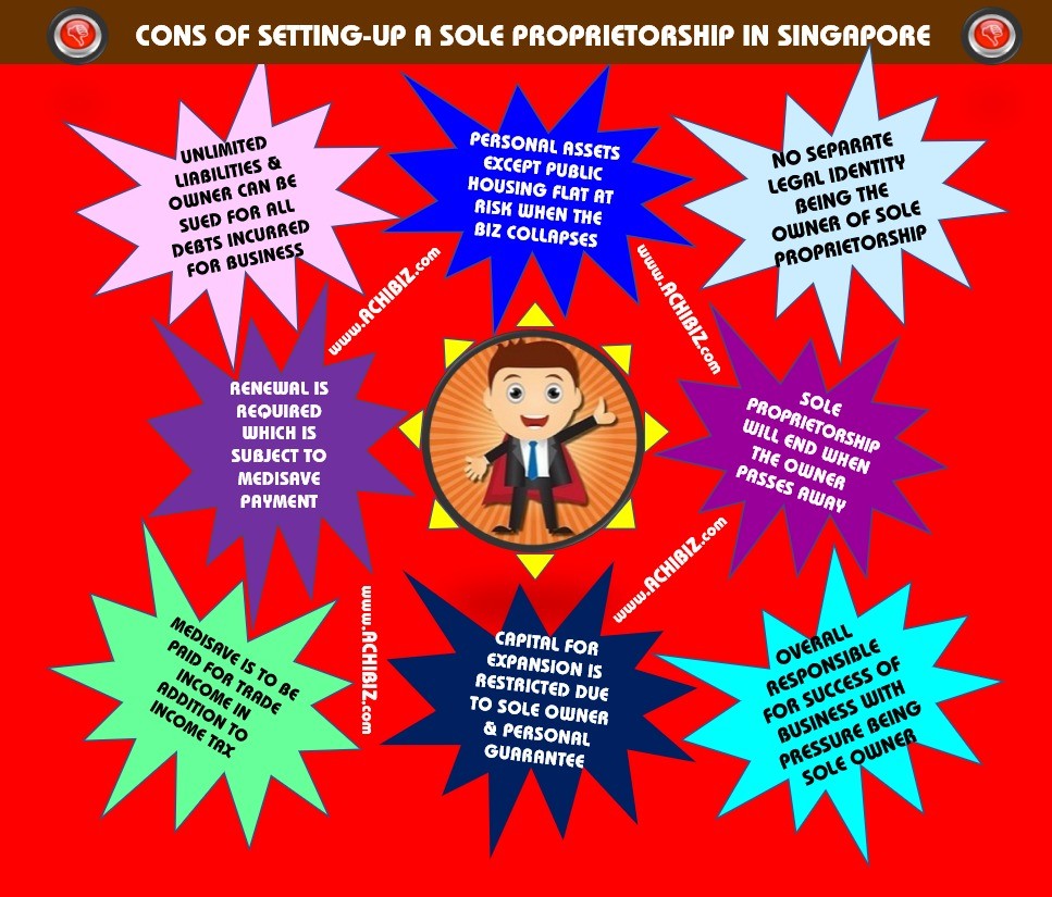 • A sole-trader has unlimited liability. This means that if the business should collapse, the sole-trader could loose not only the cash and other assets invested in the business but all his/her personal assets as well excluding HDB flat, to meet the debts of the business.
